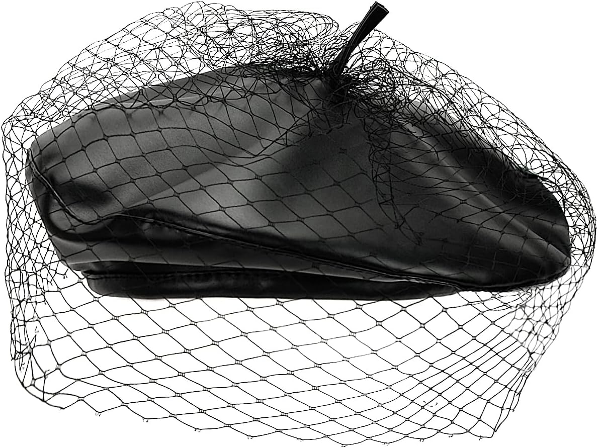 Gllutt PU Leather Beret Hat for Women with Mesh Veil Chic Artist French Beret Hat