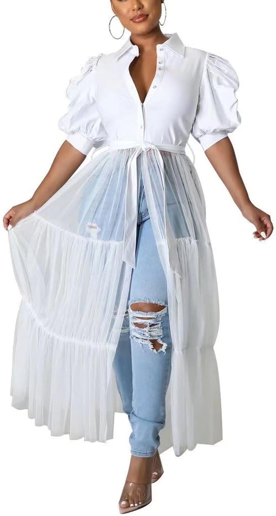 Ekaliy Women’s Casual Mesh See Through Shirts Long Dresses with Belt V Neck Button Down Club Party Outfit