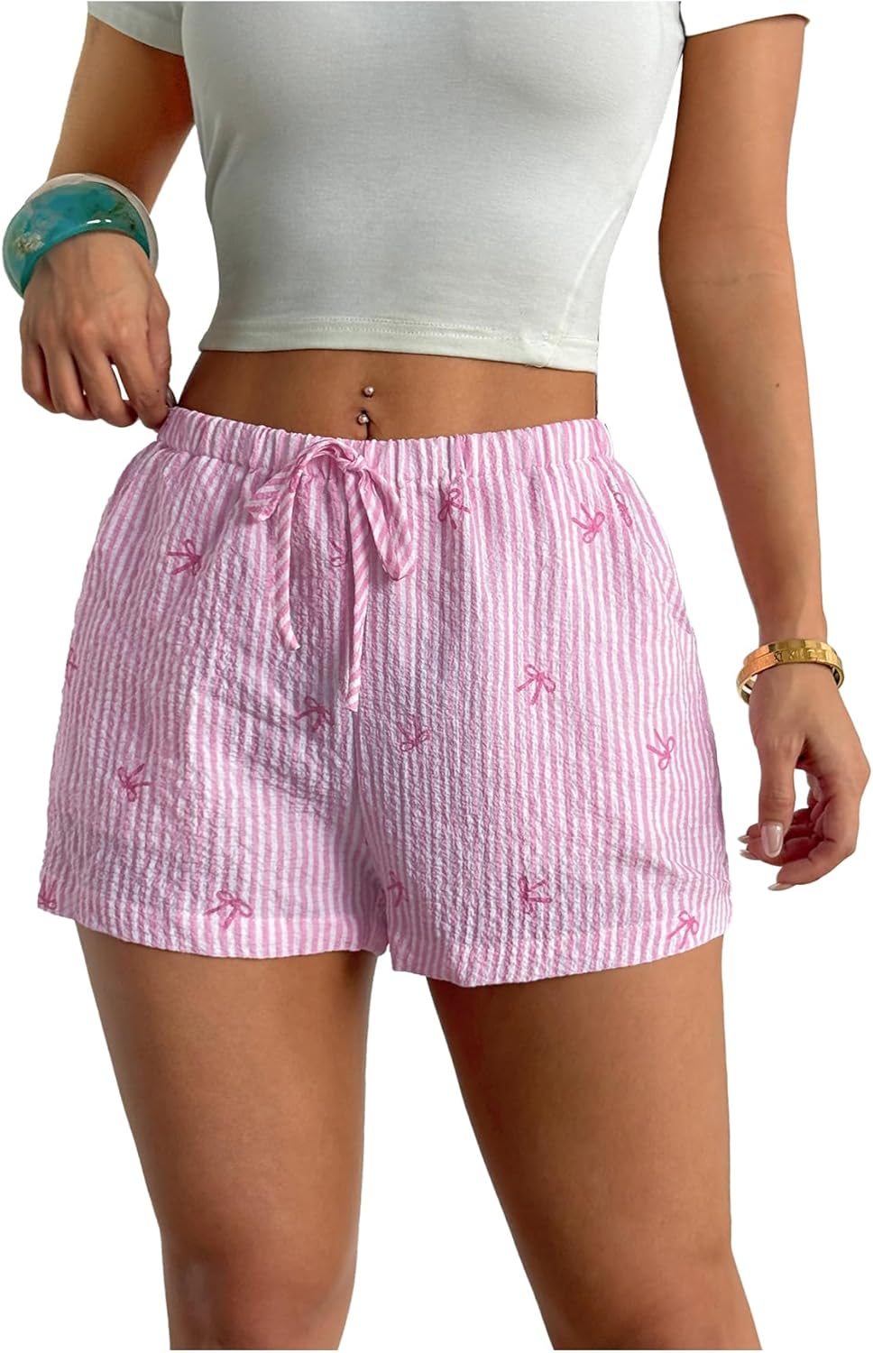 MakeMeChic Women's Striped Shorts Bow Elastic Waist Tie Front Drawstring Y2k Lounge Shorts