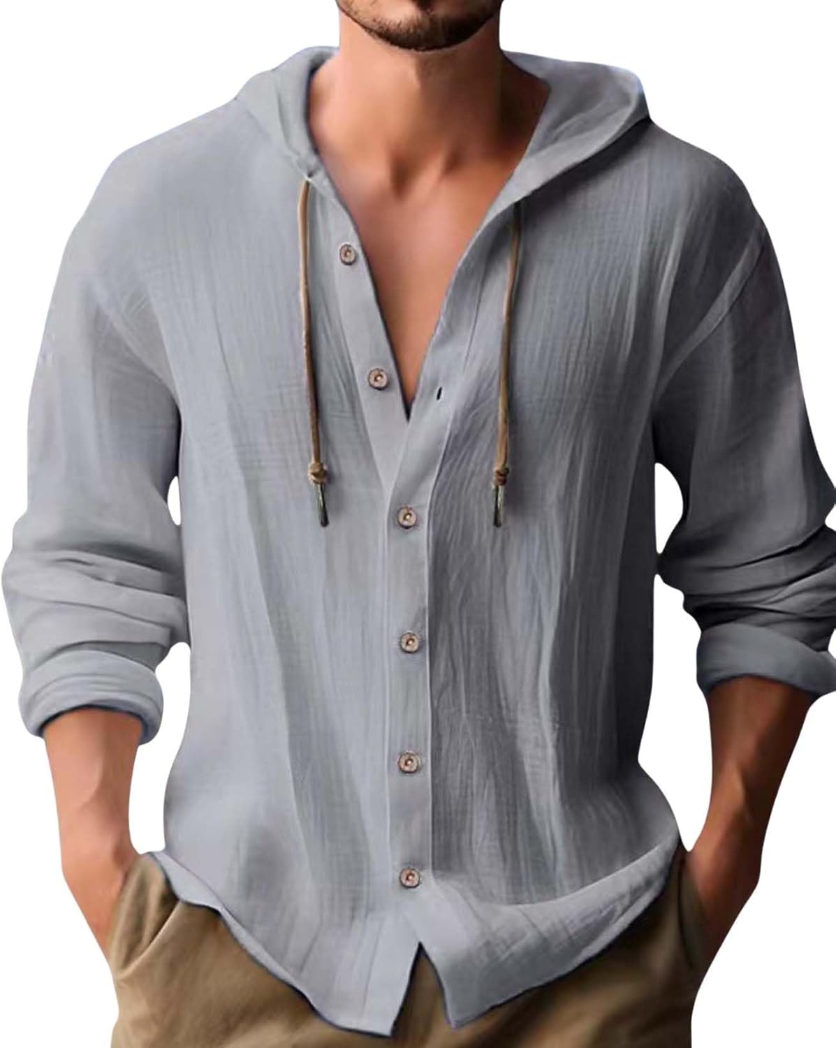Linen Hoodie Shirt for Men Long Sleeve Button Down Loose Lightweight Beach Vacation Shirts Top