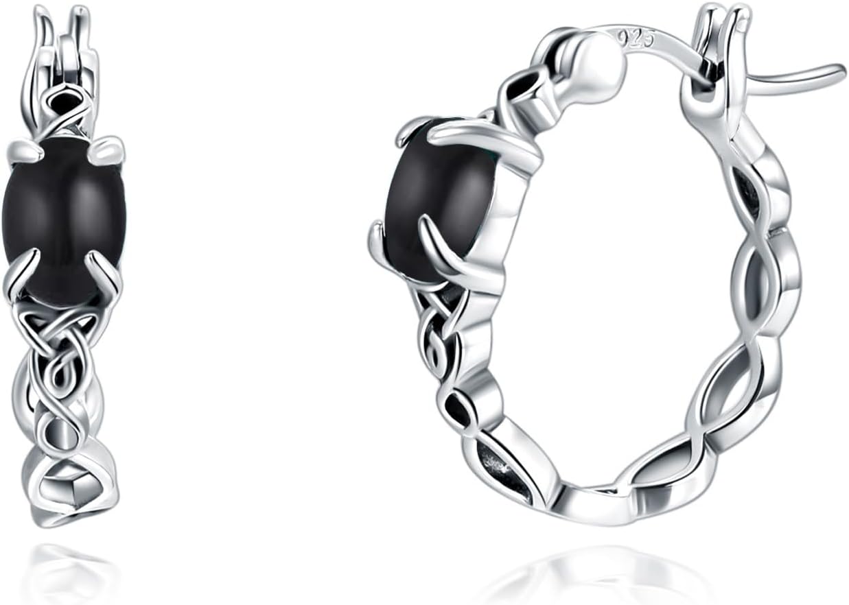 Retro Black Onyx Hoop Earrings 925 Sterling Silver Rose/Celtic Knot/Leaf with Oval Cut Black Onyx Earrings for Women