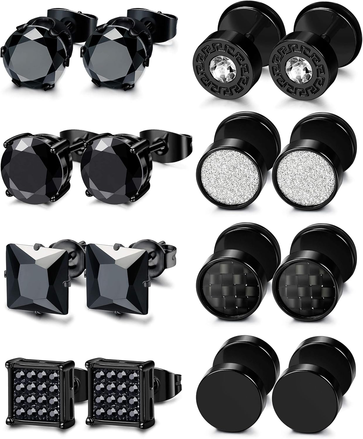 ORAZIO 8 Pairs Stainless Steel Black CZ Stud Earrings Set for Men Women Silver Cubic Zirconia Barbell Earrings(Black)