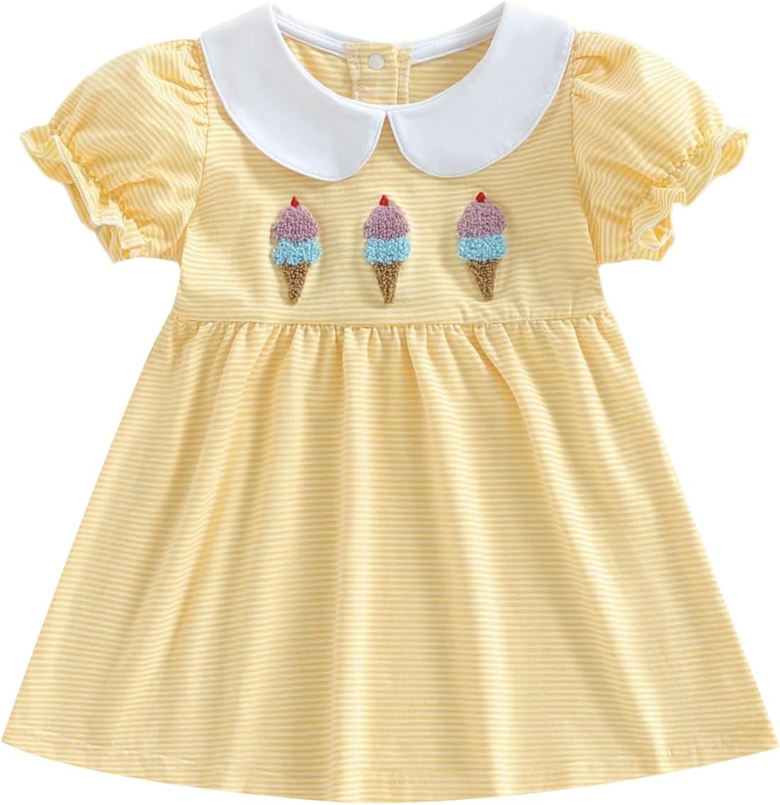 Little Kids Toddler Baby Girl Summer Clothes Puff Sleeve Doll Collar Dress Ice Cream Embroidery Stripe Dresses Playwear
