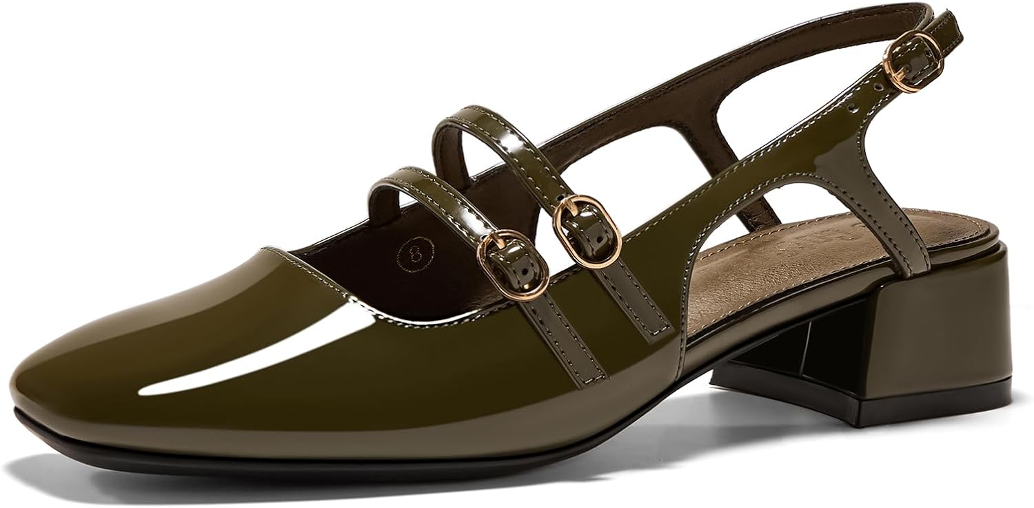 Women's Mary Jane Chunky Low Block Heels Slingback Pumps Closed Square Toe Double Strap Wedding Dress Shoes