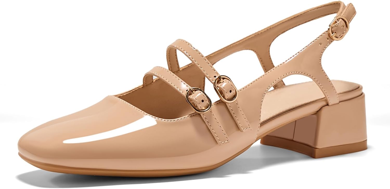 Women's Mary Jane Chunky Low Block Heels Slingback Pumps Closed Square Toe Double Strap Wedding Dress Shoes