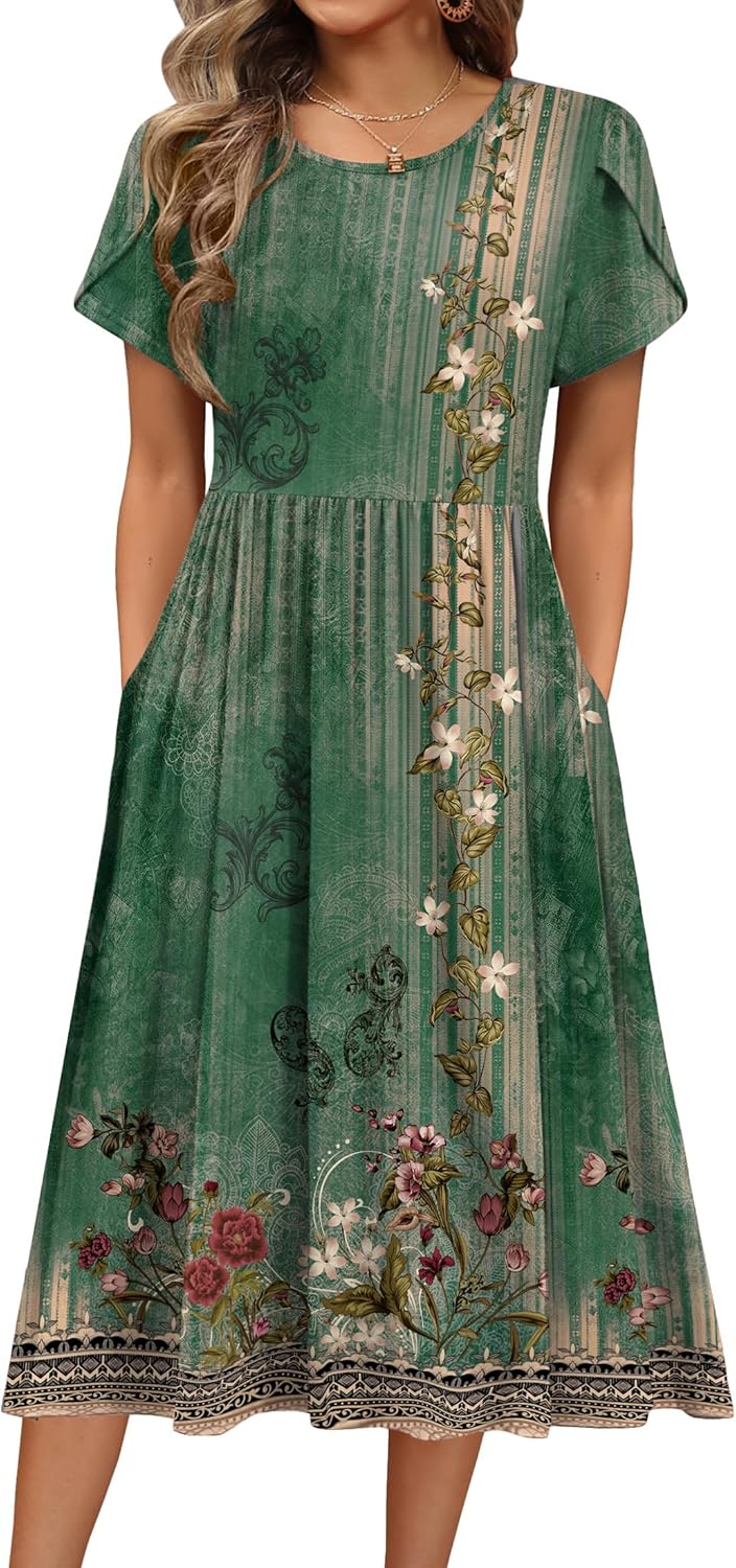 HOTOUCH Women's Summer A-Line Midi Dresses 2026 Casual Floral Short Sleeve T-Shirt Dress Flowy Beach Sundress with Pockets