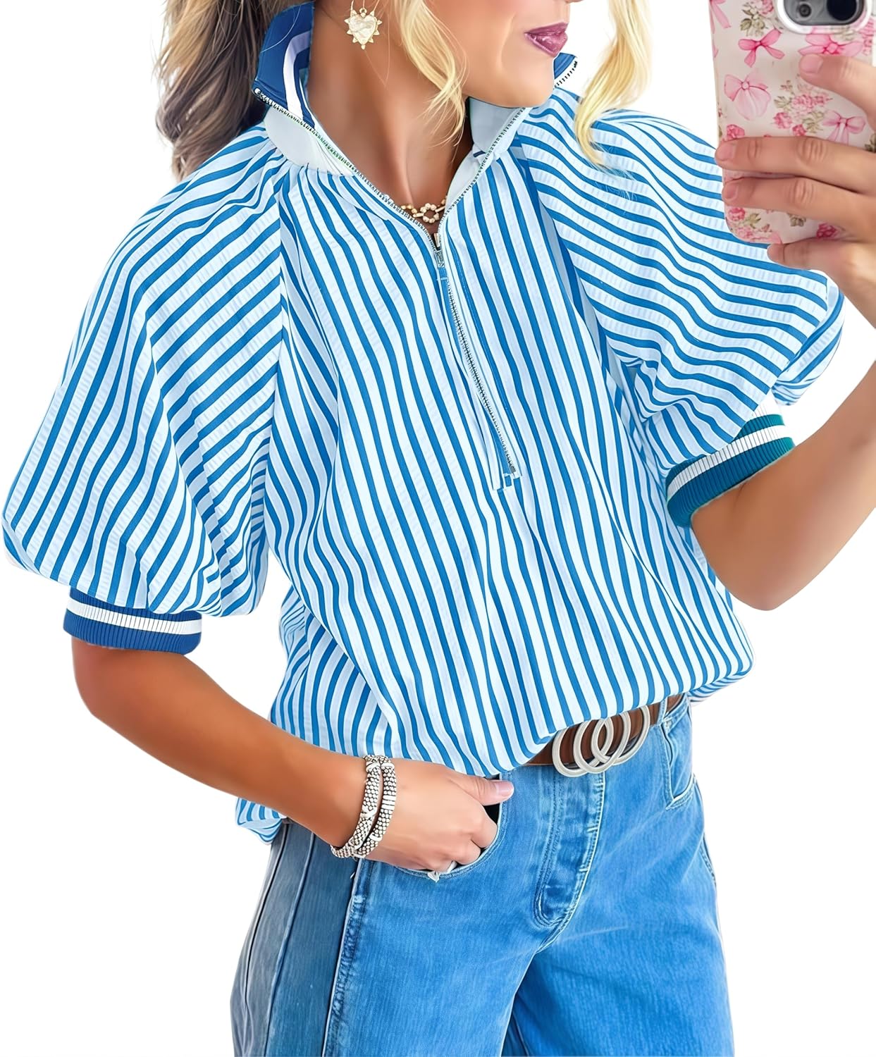 Womens Striped Puff Sleeve Blouse Half Zip Loose Color Block Ribbed Knit Collared Top