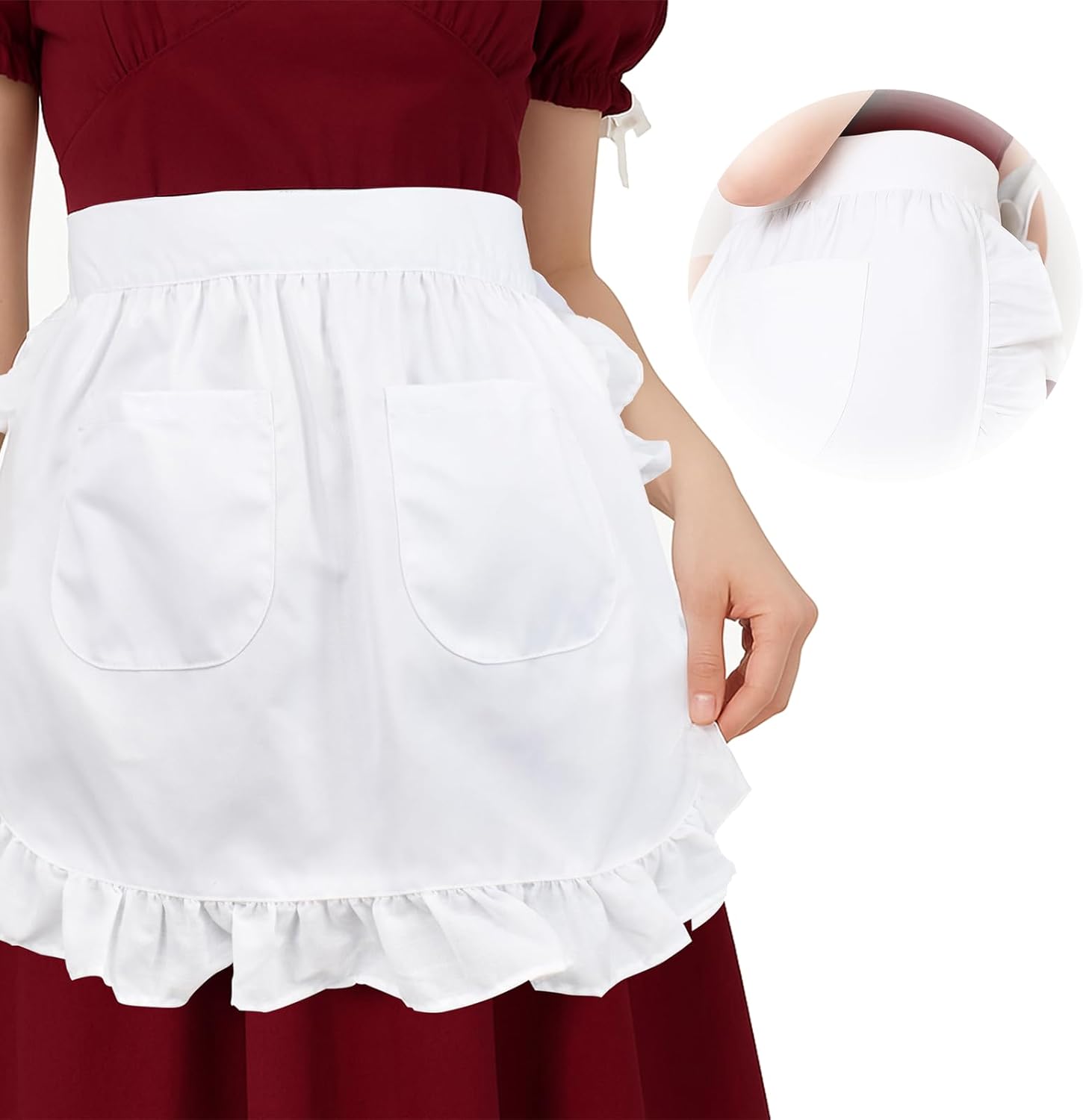 White Half Apron for Women,Maid Costume Ruffle Apron with Pockets,Waitress Servant Restaurant Maid Uniform Kitchen Cooking Apron for Halloween Cosplay, Kitchen, Cafe, Party