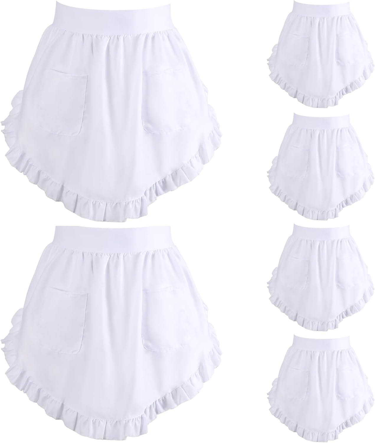 6 Pcs Elegant White Ruffle Polyester Half Aprons, 26 x 16.5 in, 74 in Ties & Pockets, Long-Lasting Waitress Maid Costume Apron for Women, Versatile for Kitchen & Hospitality