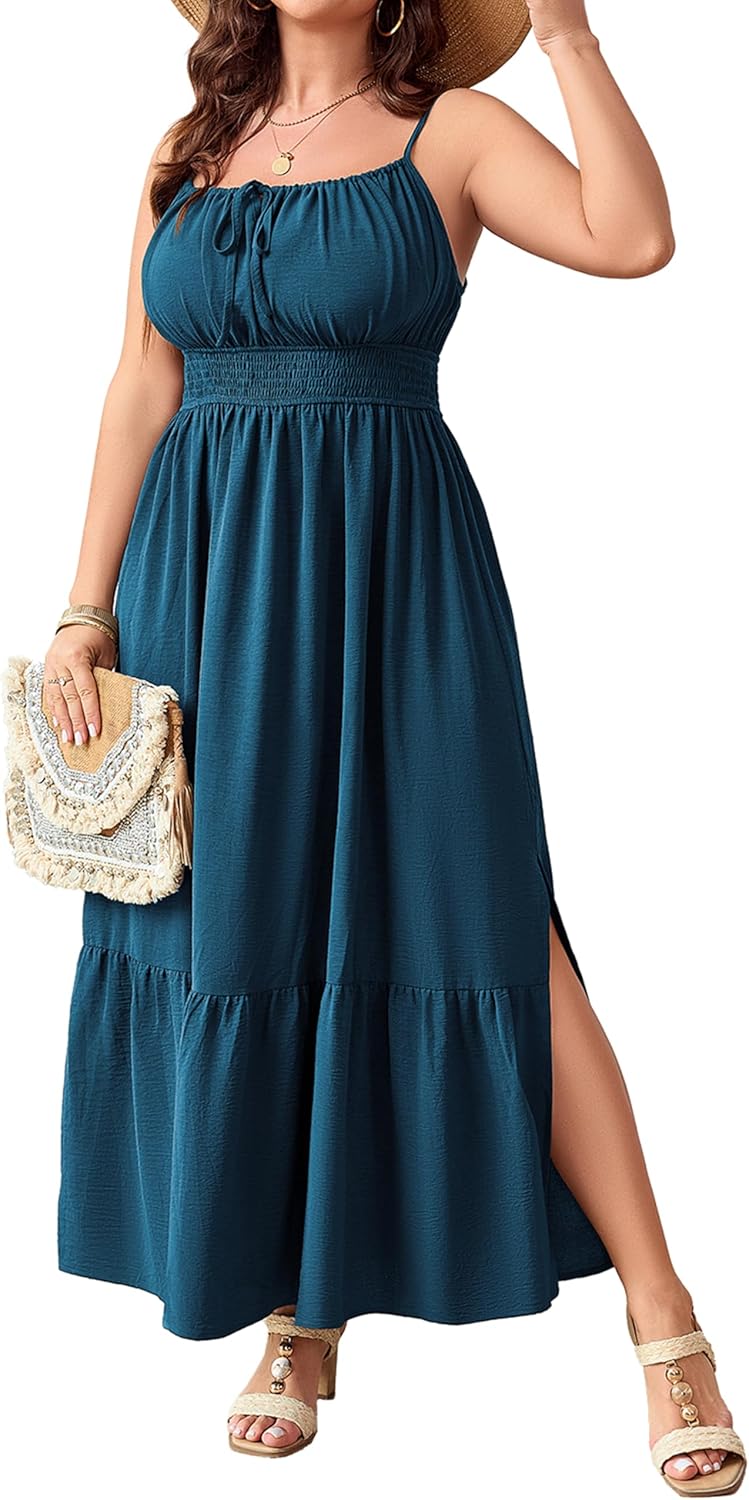 SCOMCHIC Plus Size Summer Boho Dresses Spaghetti Strap Sleeveless Casual Sundress Smocked Flowy Slit Beach Maxi Dress