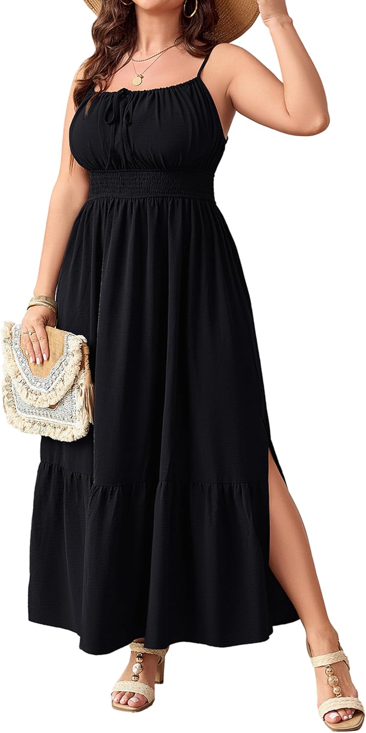 SCOMCHIC Plus Size Summer Boho Dresses Spaghetti Strap Sleeveless Casual Sundress Smocked Flowy Slit Beach Maxi Dress