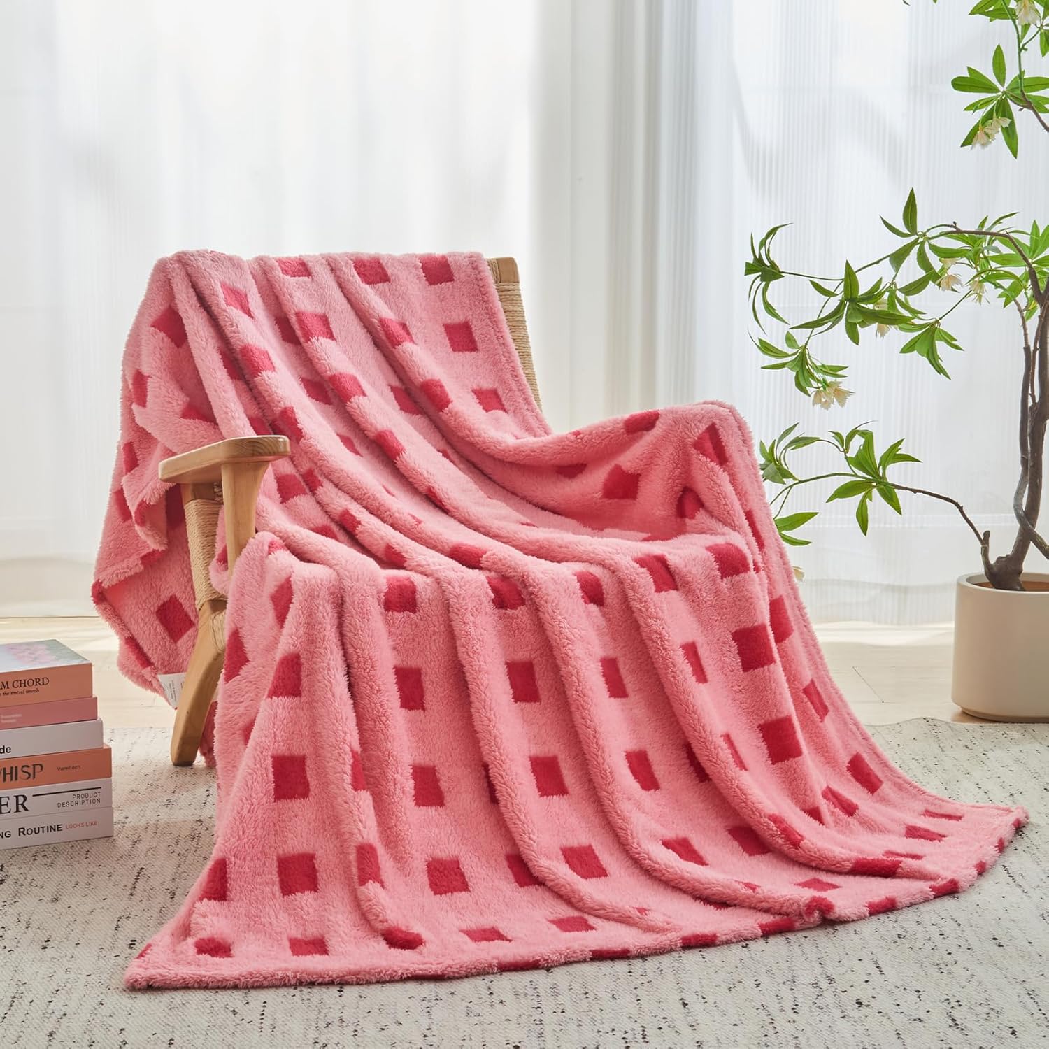 FY FIBER HOUSE Checkered Fluffy Blanket 340GSM - 3D Grid Pattern Soft Fuzzy Throw for Bed Couch Sofa, 50"x60" Hot Pink