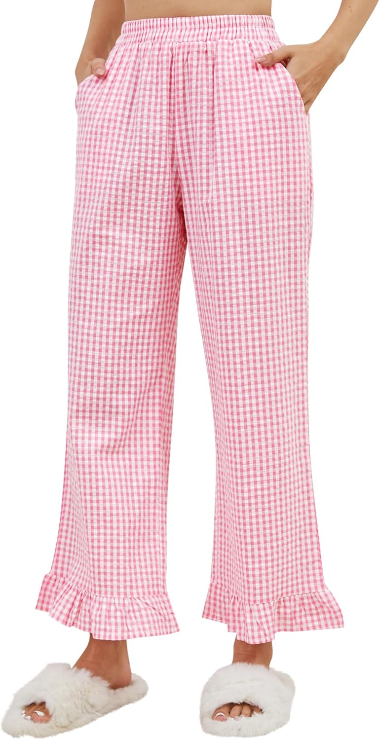 Womens Gingham Pants Y2K Cotton Wide Leg Ruffle Hem Lounge Pants Plaid Print Loose Trouser with Pockets