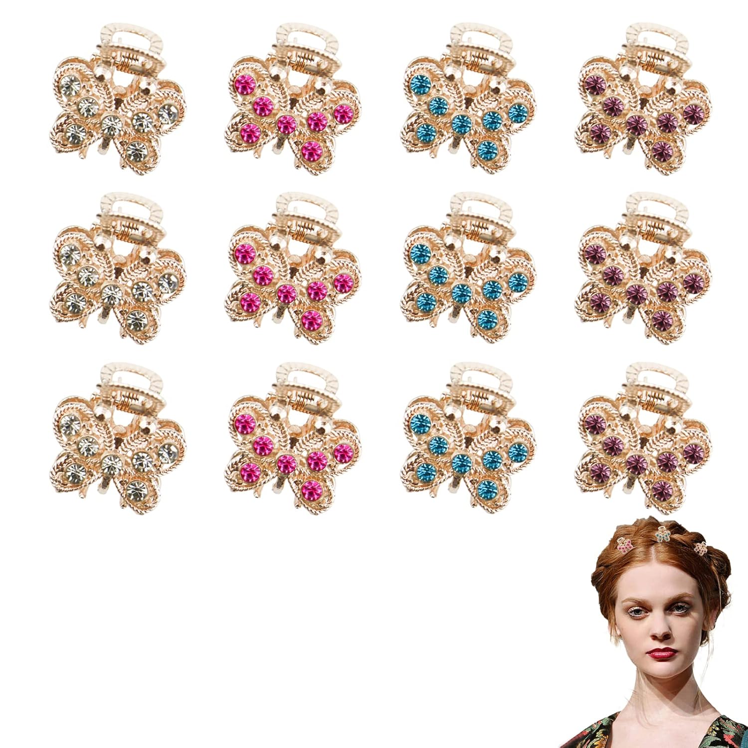 12 PACK Rhinestone Mini Butterfly Hair Claws Clips Crystal Metal No slip Hair Grip Clamps for Women Girls Hair Pins Mixed Color