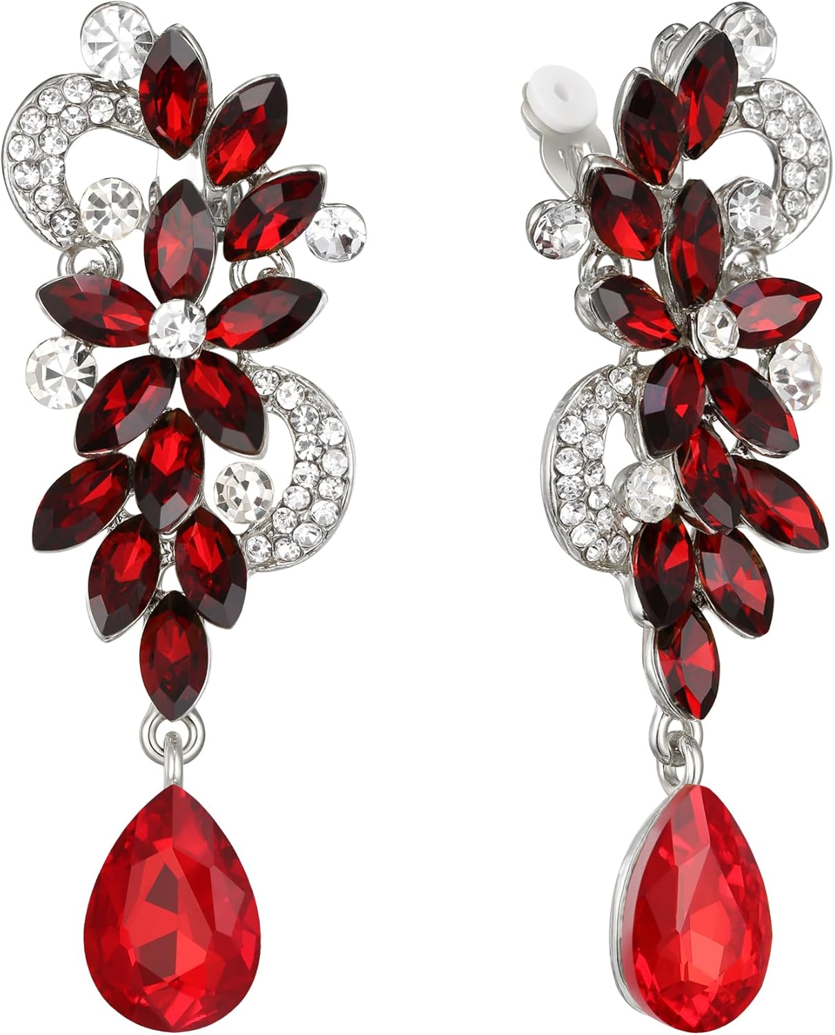 BriLove Women's Bohemian Boho Crystal Flower Wedding Bridal Chandelier Teardrop Bling Clip-On Dangle Earrings