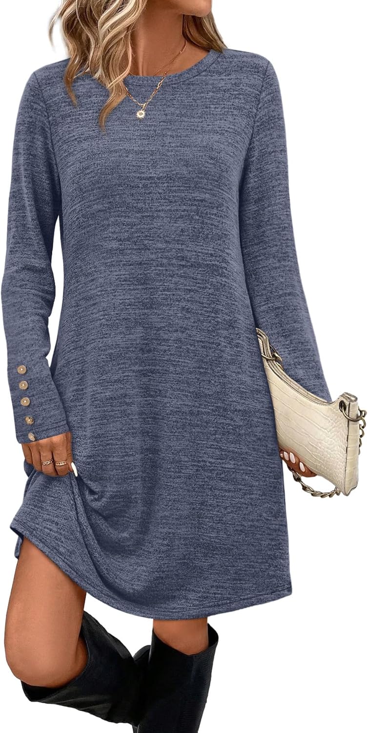 OFEEFAN Long Sleeve Dress for Women Crew Neck Tunic Dress with Pockets Decorative Buttons
