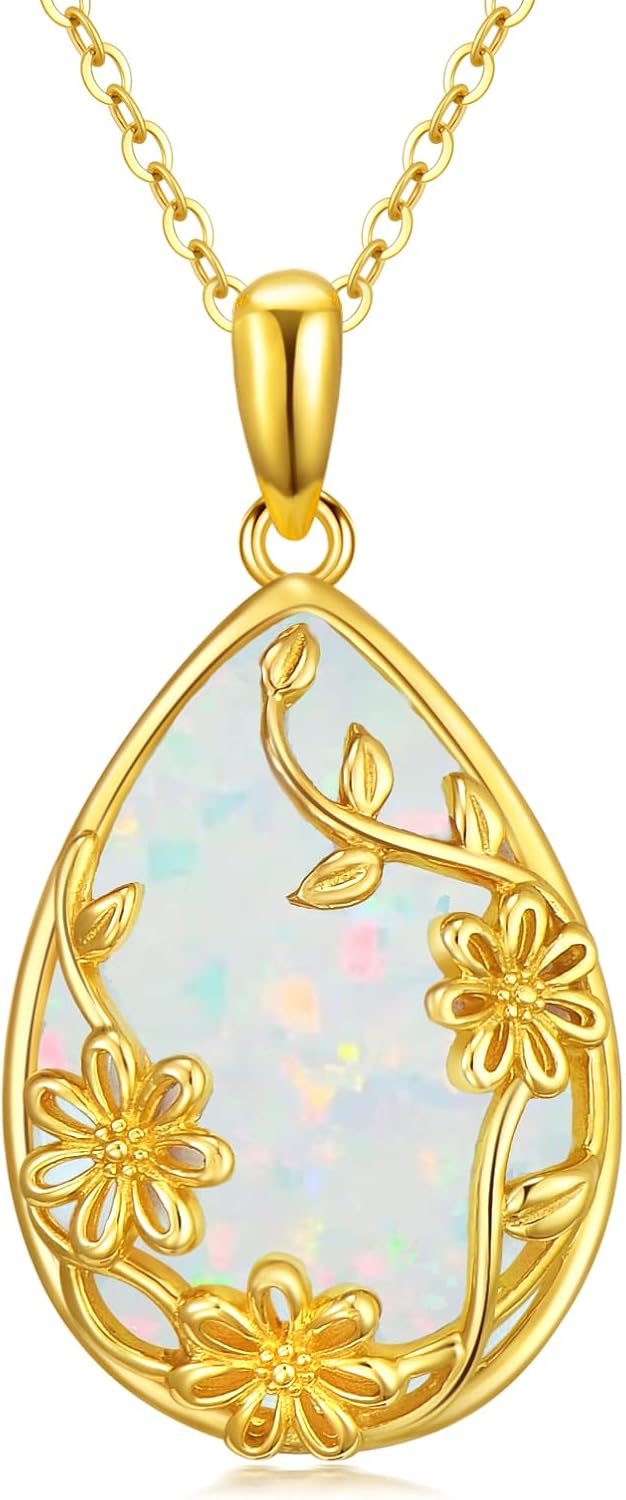 14K Solid Gold Opal Necklace for Women,14kt Real Gold Teardrop Opal Flower Pendant Necklace Jewelry Gifts for Mom Wife Christmas Birthday,16+2 Inch