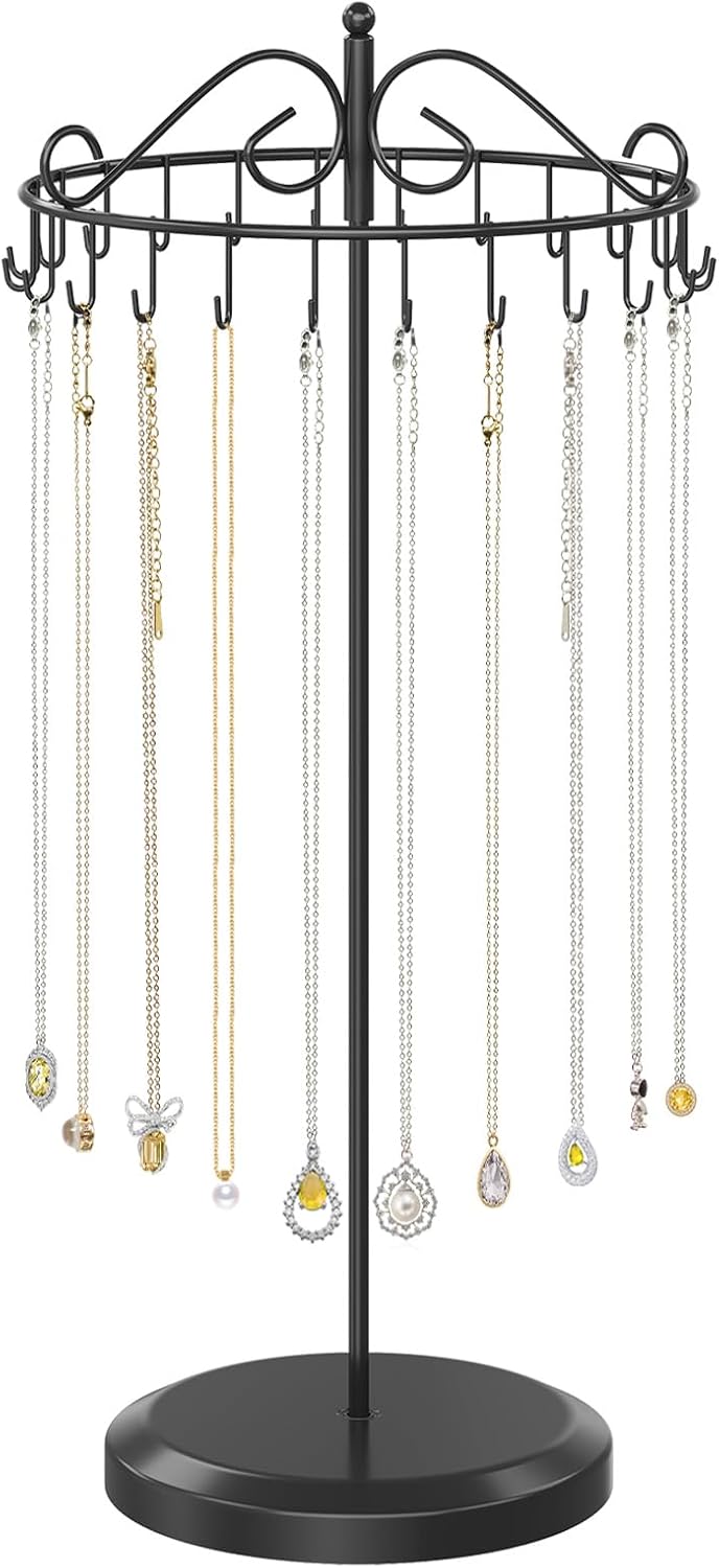 - Large Capacity & Multifunctional: This rotating necklace organizer features a unique large capacity design with 24 hooks to store more jewelry, at least 24 necklaces can be hung. In addition to hanging necklaces, the necklace tree can also display bracelets, rings, watches and other jewelry to meet your various storage needs