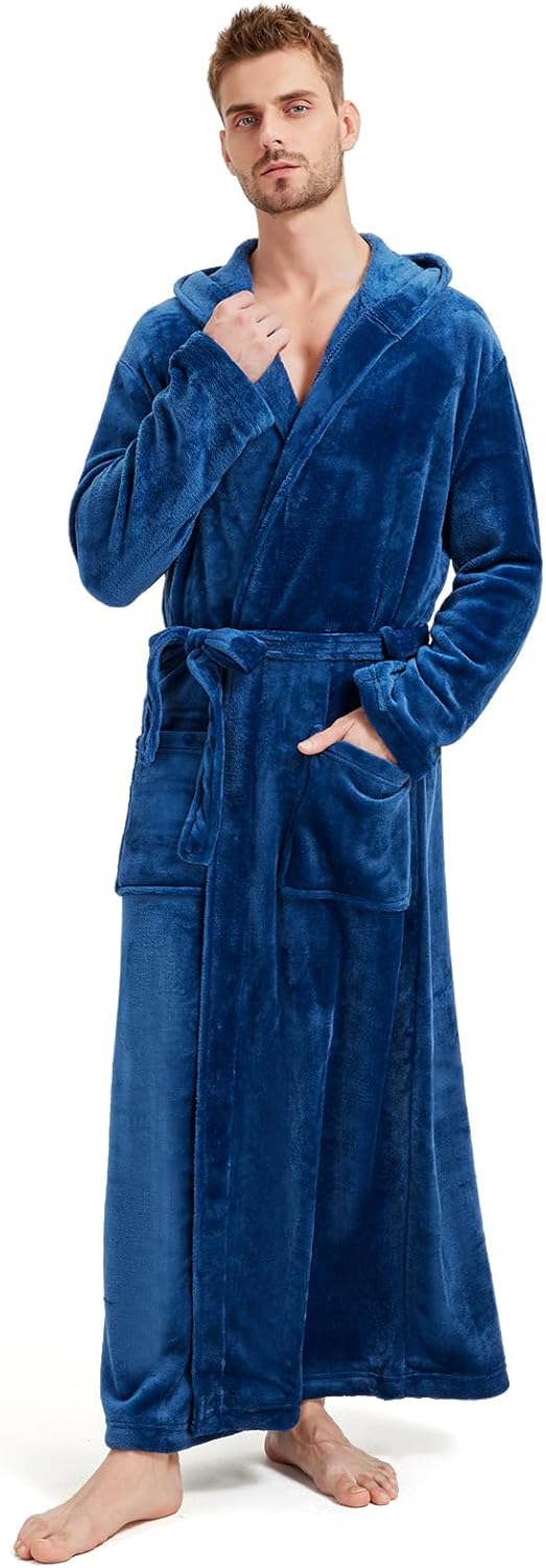Cozy Plush Fleece Robe for Men, Big and Tall Hooded Long Robe, Warm Loungewear, Shawl Collar Pocketed Bathrobe