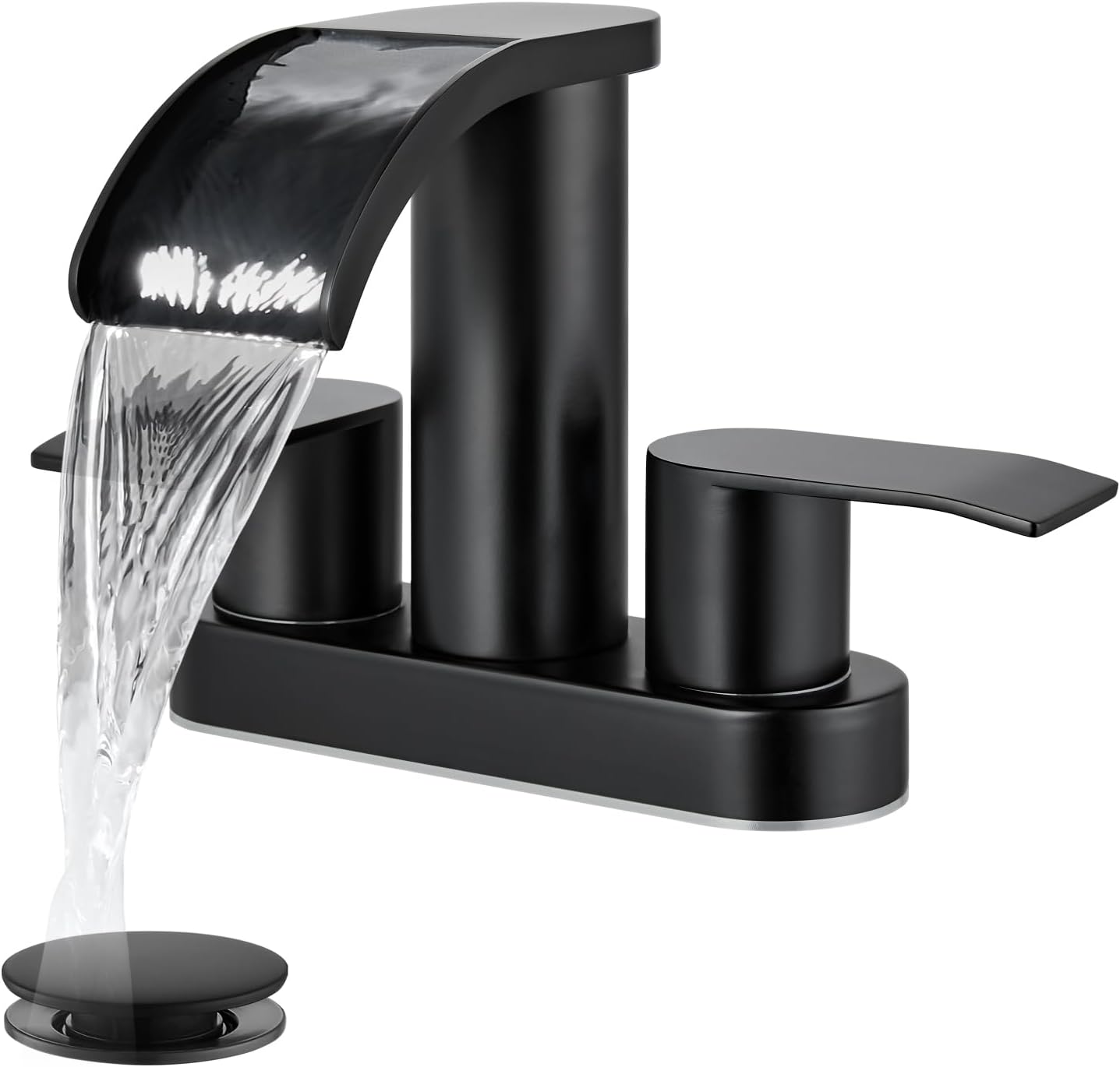 gotonovo 4 Inch Centerset Waterfall Bathroom Sink Faucet Deck Mount 2 Handle Basin Faucets 2 or 3 Hole with Pop Up Drain Included Lavatory Modern Mixer Tap Vanity Faucet Matte Black