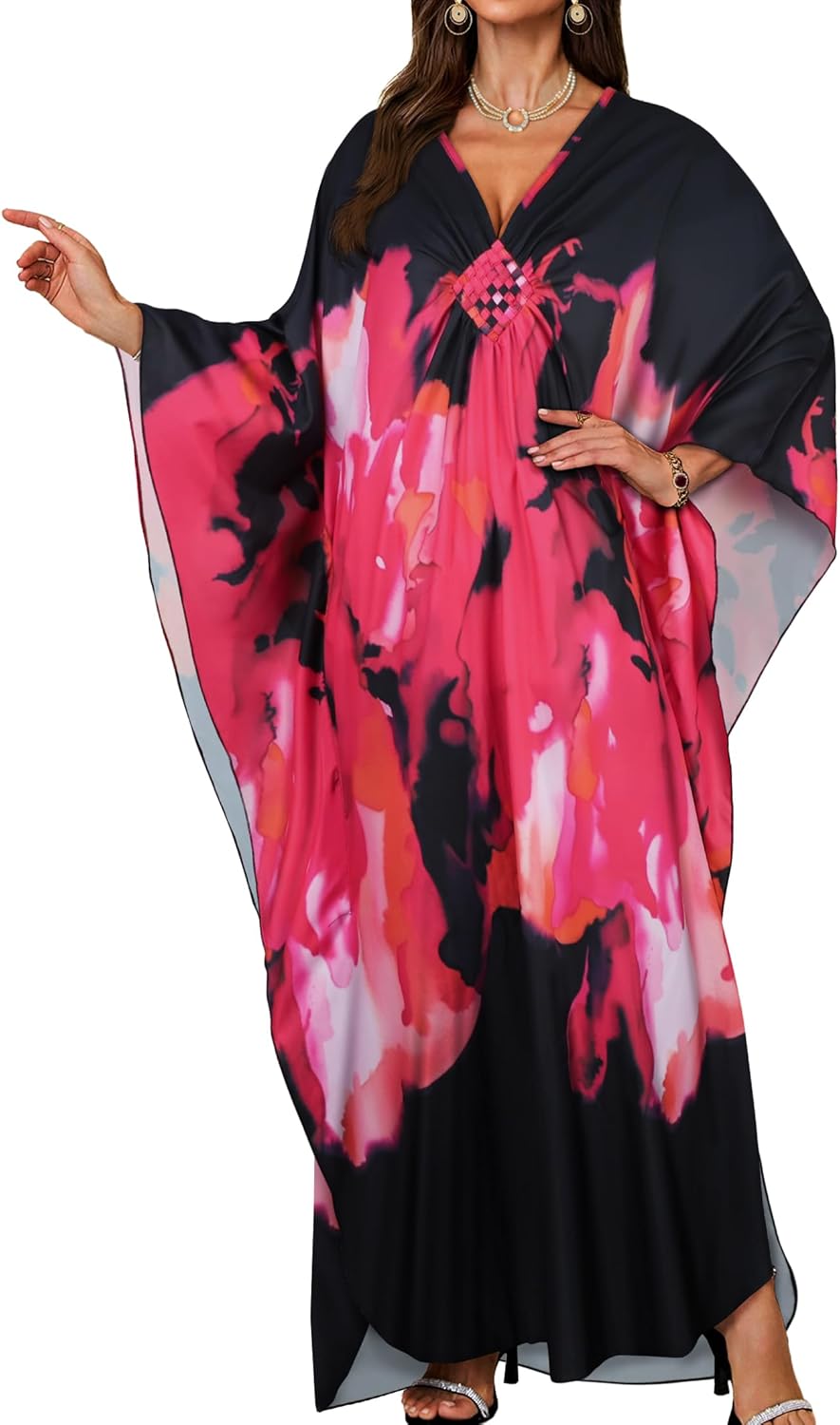 Kaftan Dresses for Women Plus Size V Neck Caftans Long Batwing Sleeve Beach Cover Ups Summer Floral Print Dress