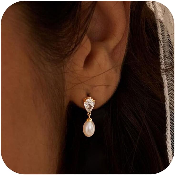 Pearl Earrings for Women,Dainty 14k Gold Plated Pearl Drop Earring Gold Bridal Dangle Earring Small Cute Stud Earring Wedding Dangle Earrings for Women Trendy Pearls Jewelry Bridesmaid Gifts Stuff