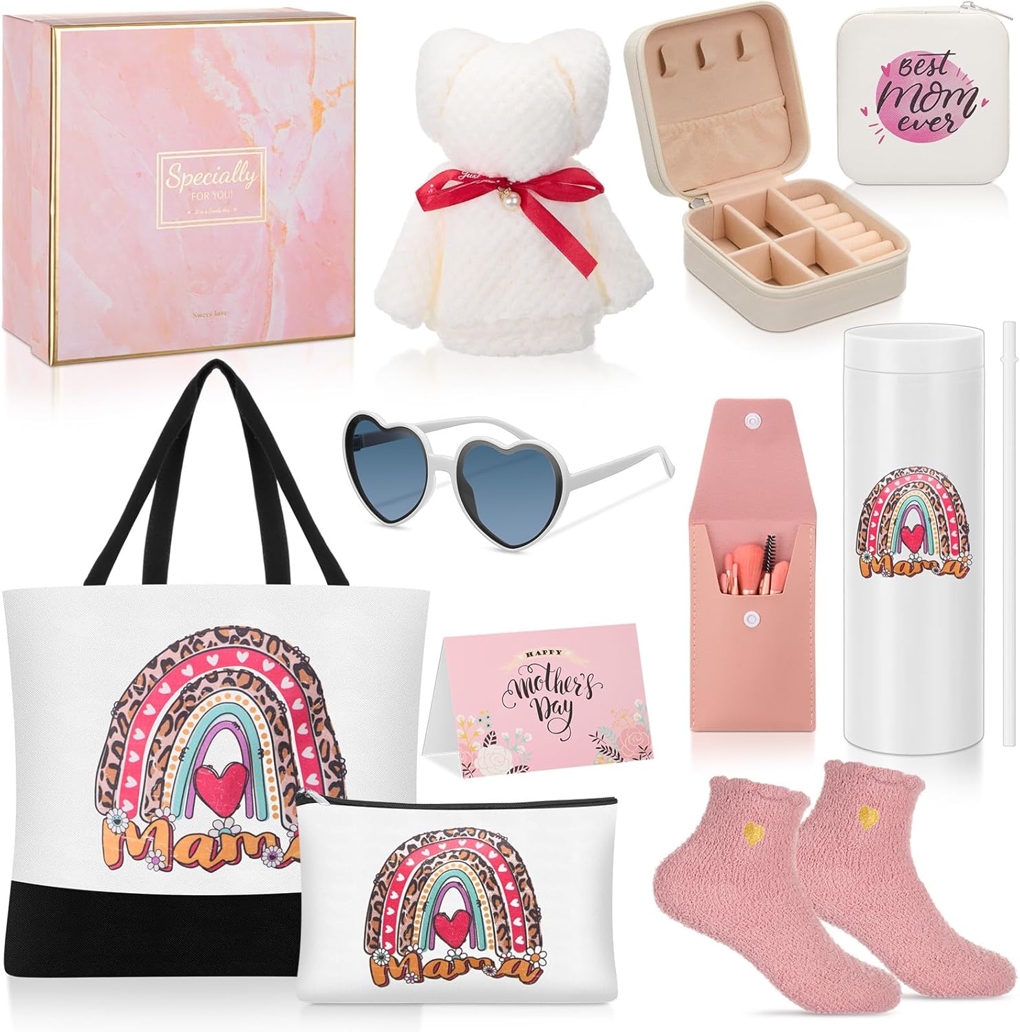 - The Ultimate Expression of Love: the mom gift set is the ideal thoughtful gift for moms, mothers in law, and new mothers; This carefully curated set includes 1 tumbler, 1 jewelry box, 1 makeup brush set, 1 towel, 1 makeup bag, 1 sunglasses, 1 fluffy socks, 1 canvas bag, 1 greeting card, and 1 gift box, all beautifully packaged for an unforgettable gifting experience