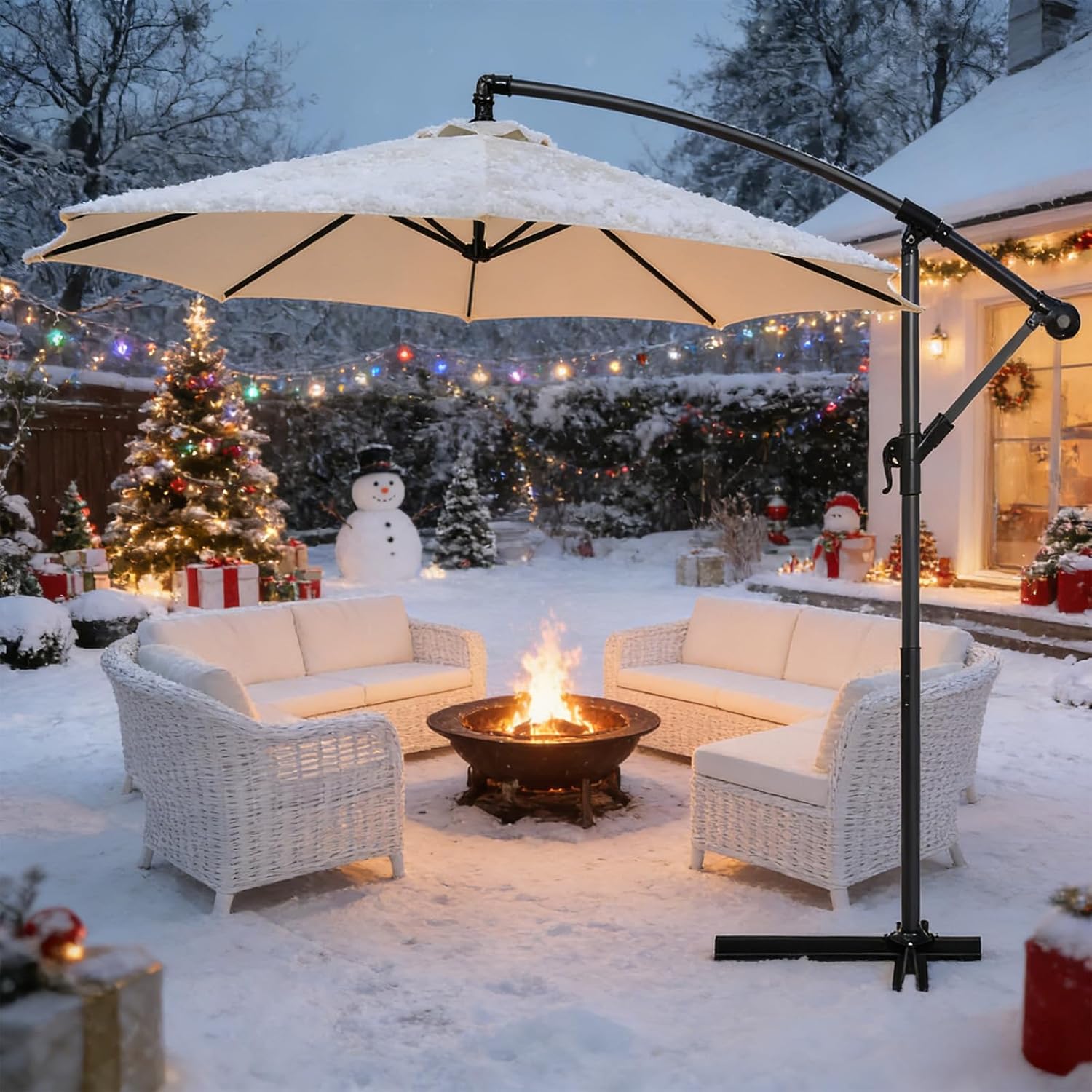 10ft Offset Hanging Market Patio Umbrella w/Cross Base, Outdoor Large Round Aluminum Cantilever Umbrella w/Easy Tilt Adjustment, Fade Resistant Waterproof 8 Ribs Canopy, for Yard, Garden & Dec