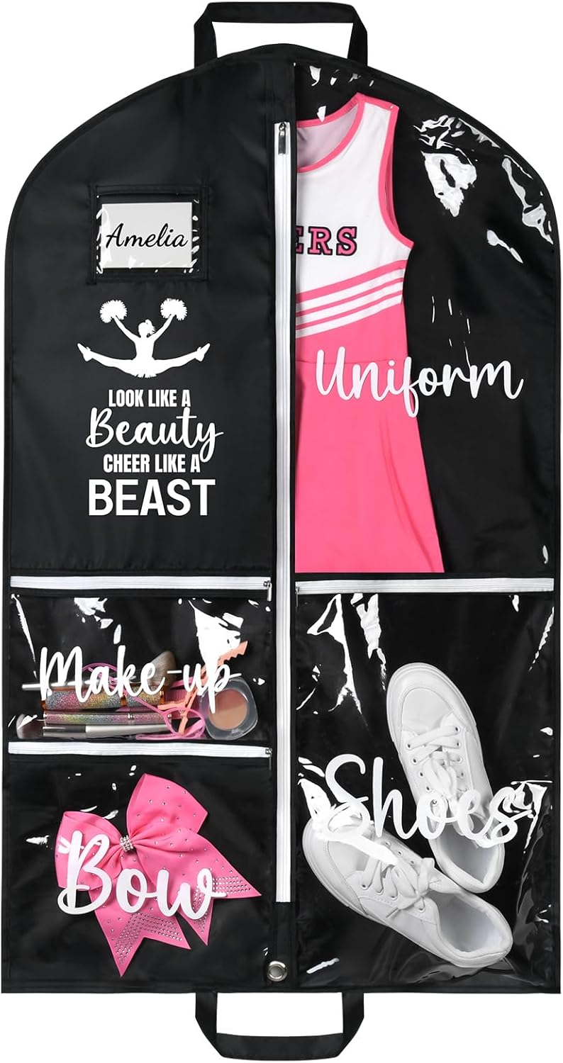 - Easy Identification Features – Equipped with a clear PVC ID card holder for labeling, plus transparent zippered pockets, this dance bag for hanging clothes allows you to find cheer stuff quickly