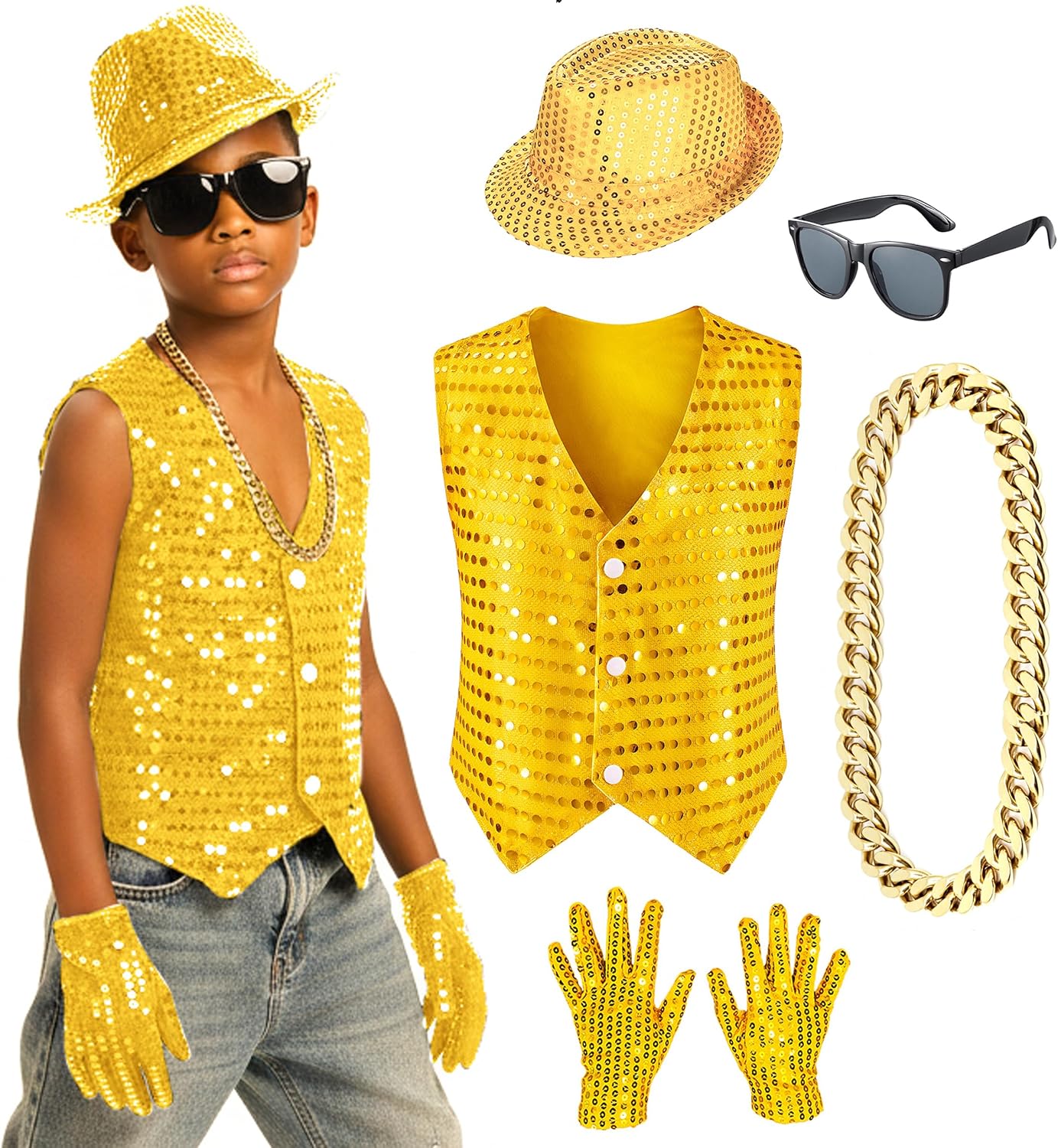 Kids Dance Hip Hop Jazz Costume Boys Sequin Vest Hat Glasses Set for Dance Party 3-12 Years