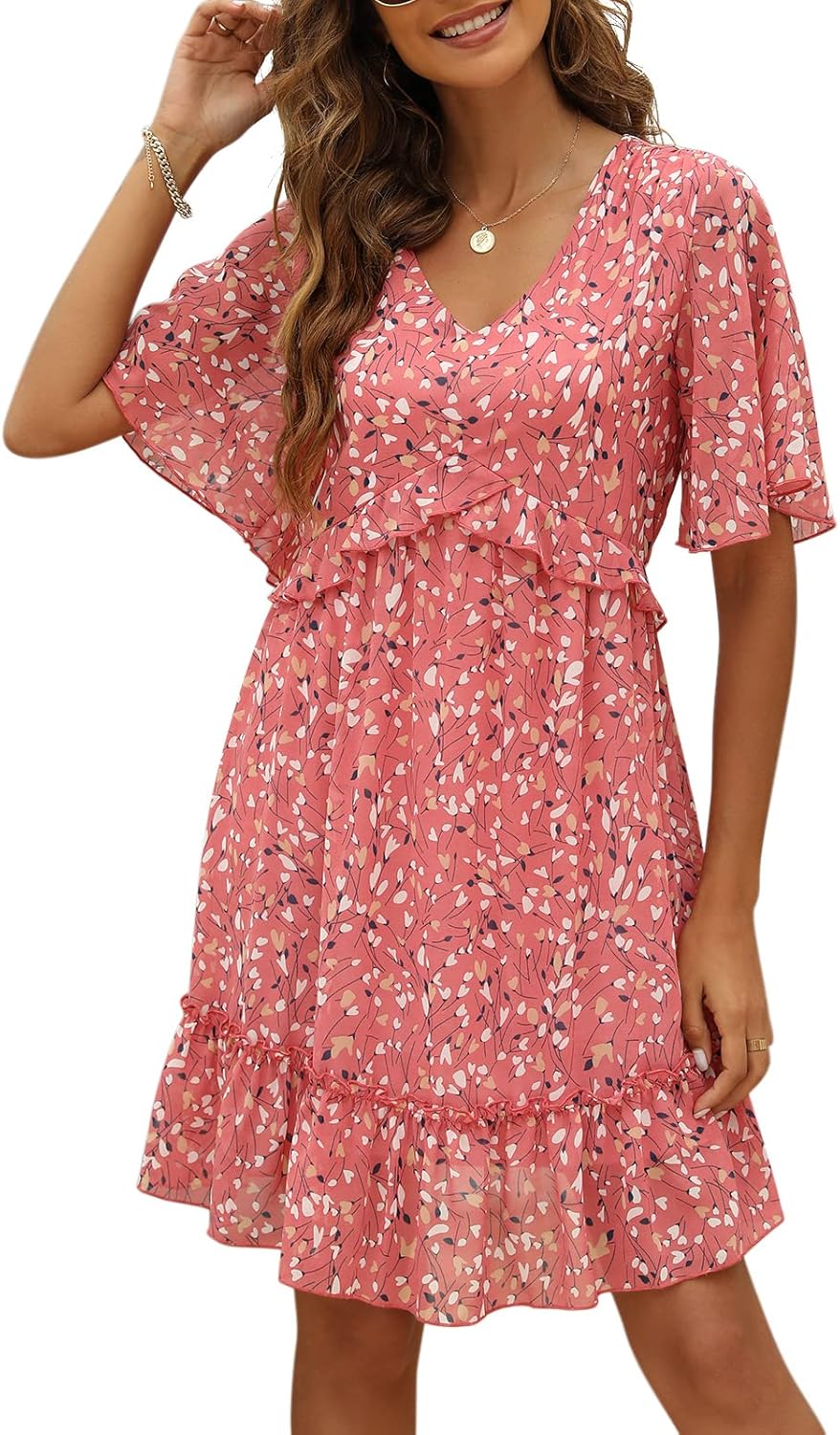 Manydress Women's Chiffon Floral Print V Neck Casual Mini Boho Ruffle Swing Dress MY068