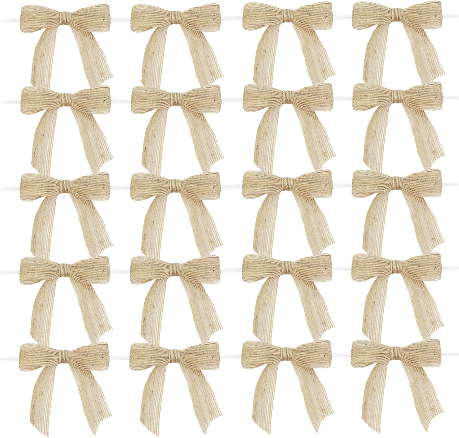 - PACKAGE INCLUDE - Package includes 20 pieces natural burlap bows with twist tie on the back; each bow is about 3.4 x 3.4 inch, which is the suitable size and enough to meet consumers' decorative needs