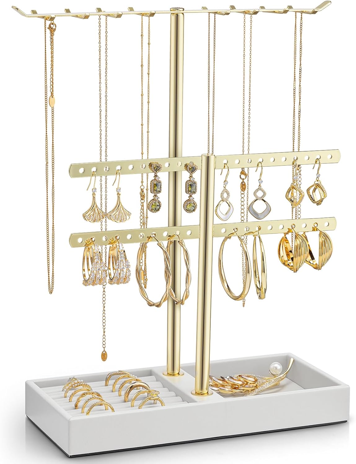 VLANDO 2 Tier Jewelry Stand Organizer with Tary, Leather Jewelry Holder Display for Women, Gold Jewlery Holder Stand for Necklace, Earring, Bracelet, Rings - White