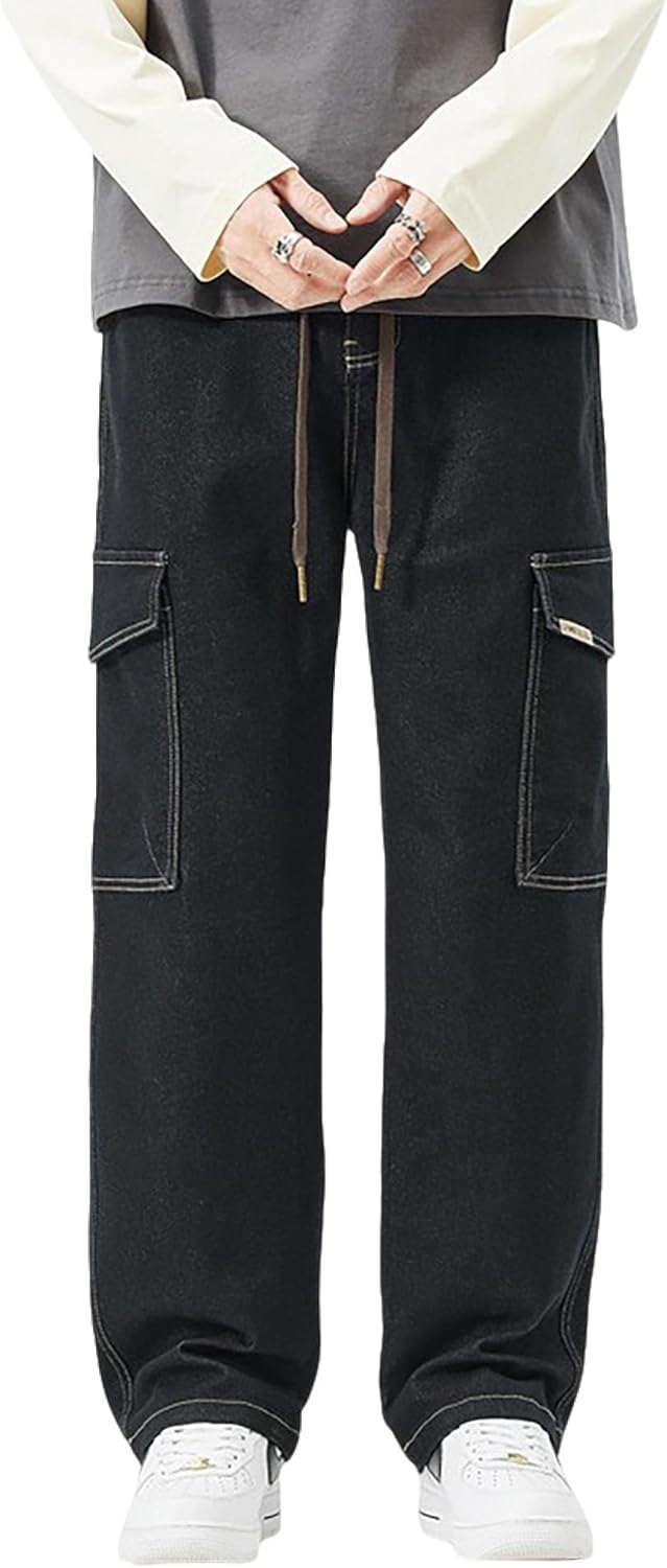 Men's Japanese Street Vintage Jeans Baggy Drawstring Cargo Pants Elastic Waist Pants Pants for Men Fashion(Black,L)