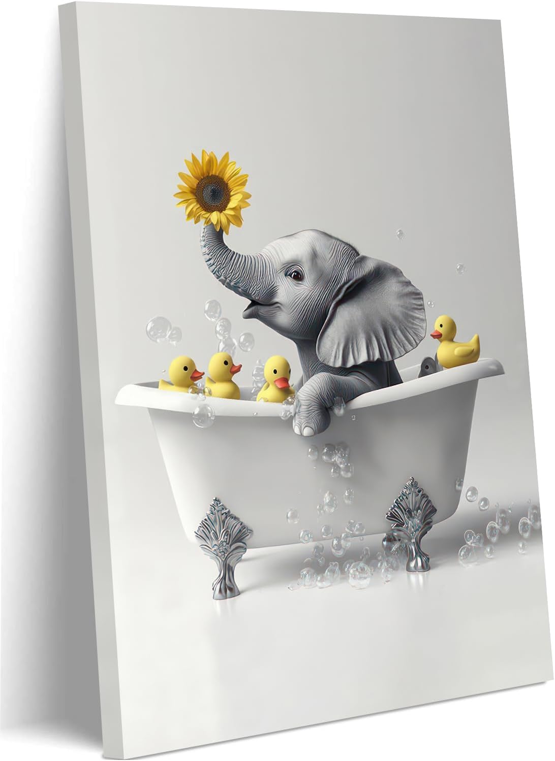 - Fun bathroom wall painting This decorative painting presents you with a fun and interesting picture with its unique creativity. The painting depicts a gray baby elephant bathing in a white bathtub. Its happy expression, bright eyes, and the yellow sunflower held high show its cheerful and lively side, enjoying the fun of bathing. The company of several yellow ducklings in the bathtub and the transparent bubbles floating around add endless innocence to the whole picture.