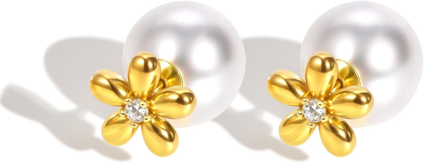 Dainty Daisy Flower Pearl Earrings for Women 18K Gold-Tone Plated Stainless Steel Floral Stud Earrings Hypoallergenic Crystal Front Back Ear Jackets Wedding Bridal Valentine Jewelry