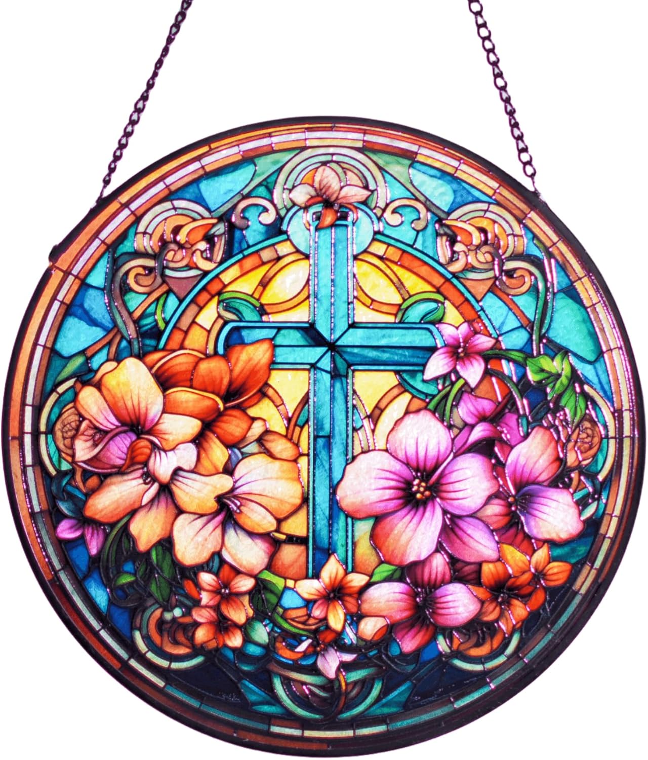 Flowers Cross Stained Glass Window Hanging, 8''/20CM Suncatchers for Windows Flowers Cross Decorative Hanging Ornaments Stained Glass for Chirstmas Suncatcher Window Panel Gift for Home Decor (C)