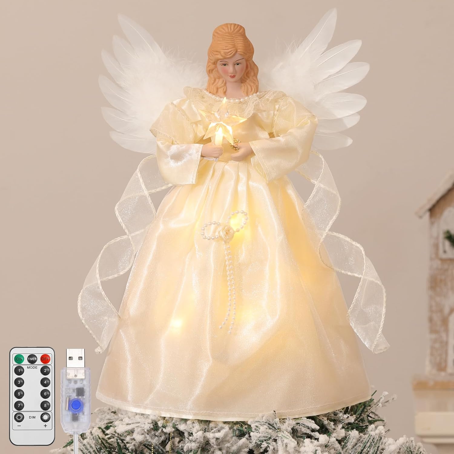 - USB and Remote Control: Simply plug the 9.8ft USB cable into the power adapter (not included) to easily power the Christmas tree topper angel. You can control the switch and lighting modes via the USB button. You can also use the included remote control to easily control the switch, timer, lighting modes and brightness, allowing you to operate it effortlessly from the ground.