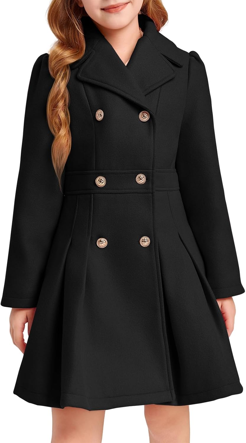 Haloumoning Girls Winter Dress Coat Button Peacoat Notch Lapel Double Breasted Outerwear with Pockets 5-14 Years