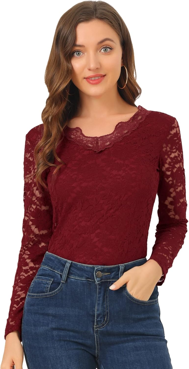 Allegra K Women's Floral Embroidery Sheer Long Sleeves Lace Blouse Top