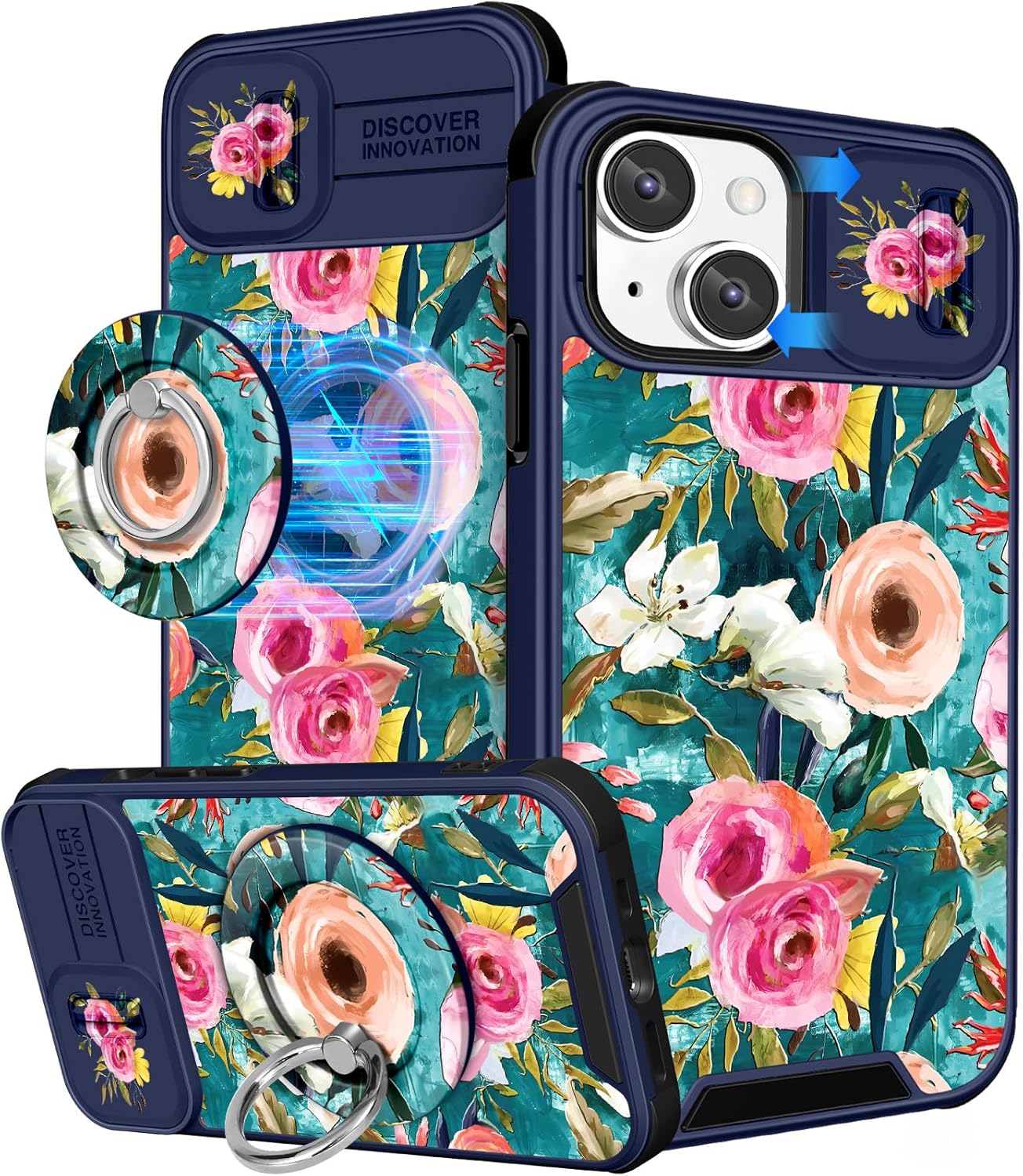 Buleens for iPhone 14 Case 6.1 Inch - with Ring Stand & Camera Cover Aesthetic Cute Designed for Women Girls Girly Pretty Lake Blue Flowers for Phone Case for iPhone 14 Compatible with Magsafe