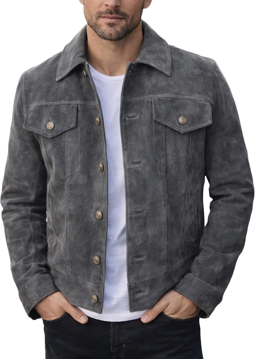 LP-FACON Mens Trucker Suede Leather Jacket - Western Style Cowboy Jacket Collection