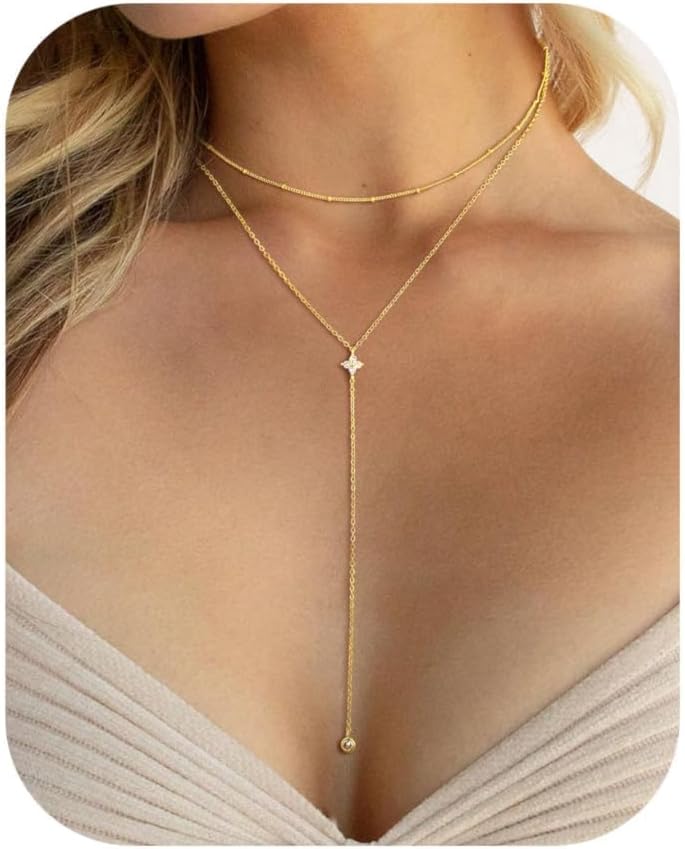 Ursteel Dainty Lariat Necklace for Women, Valentines Gifts 14K Gold Plated Y-Shaped Long Necklace Layered Drop Necklaces Pearl Cross Clover Cubic Zirconia Charm Necklaces Jewelry Gifts for Women