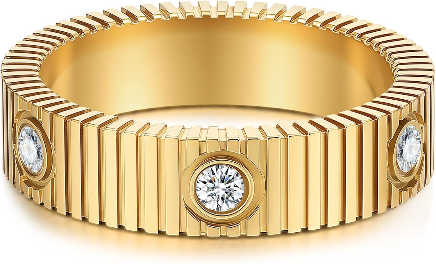 PDWZNBA Linear Stripe Textured Ring | 14K Gold-Plated Stainless Steel Promise & Friendship Ring, Wedding Band, Birthday Gifts for Women