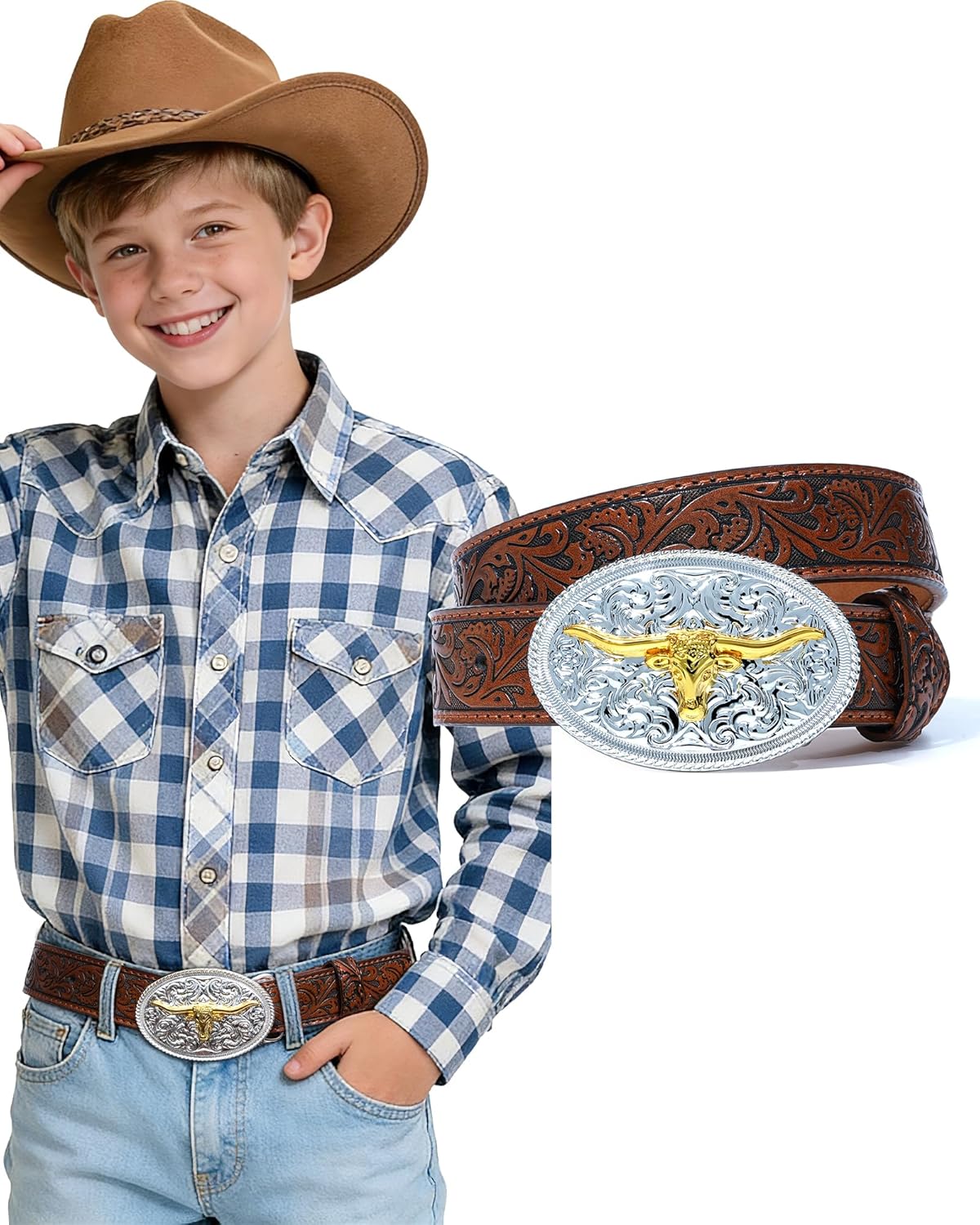 Kajeer Kids Western Belt for Boys Girls, Cowboy Leather Embossed Western Longhorn Bull Buckle Belts for Jeans