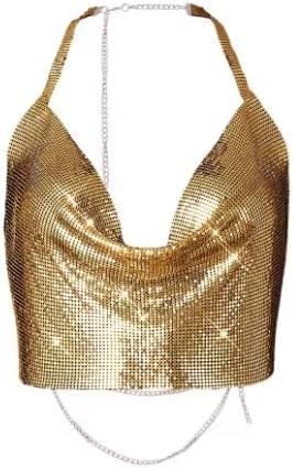 Christmas Women’s Sexy Metallic Sequins Halter Crop Top Deep V Neck Backless Vest Shirt Clubwear Rave Outfit 50 * 30CM(Gold)