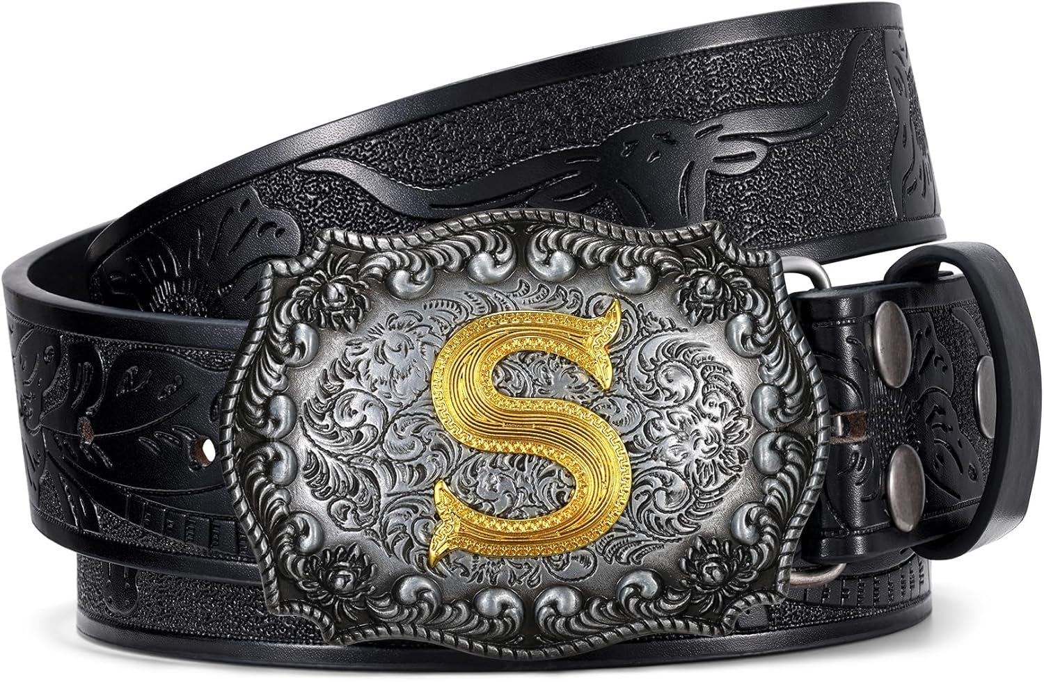 TRIWORKS Cowboy Belt for Men Women Western Belt Initial Letter A to Z Buckle with Engraved Cowboy Leather Belt
