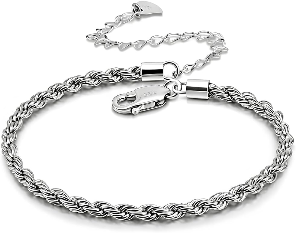 Women's 925 Sterling Silver Italian 3MM Twist Rope Chain Adjustable Anklet with Lobster Clasp, Up to 10.5 inches
