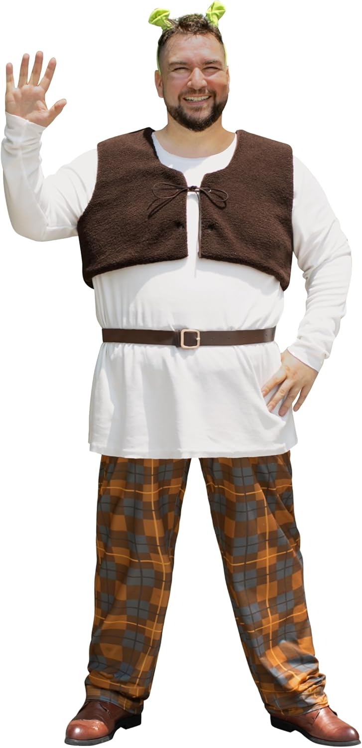 Men 6 Pcs Swamp Creature Costume Halloween Green Shirt Set Vest Pants Belt Headband Makeup (S-3XL)