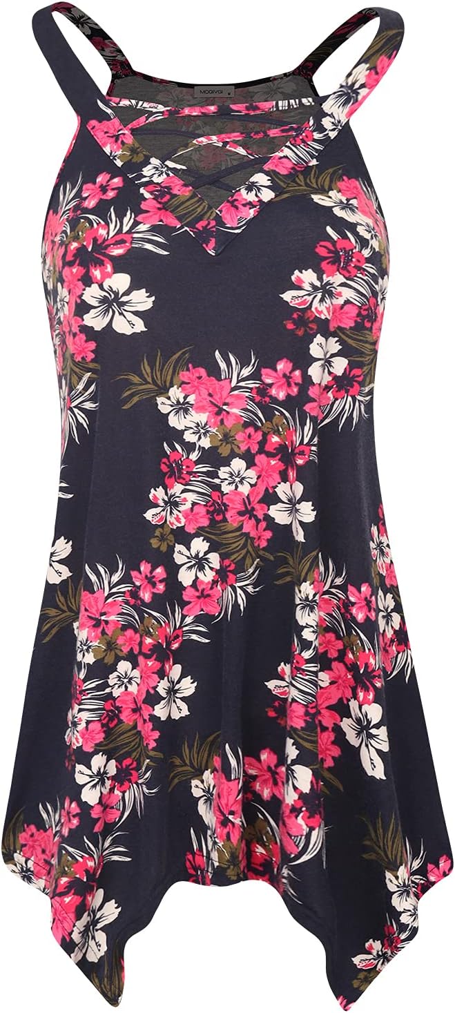 MOQIVGI Womens Sleeveless Tops Trendy Sexy Casual V Neck Criss Cross Asymmetrical Hem Tunic Tanks